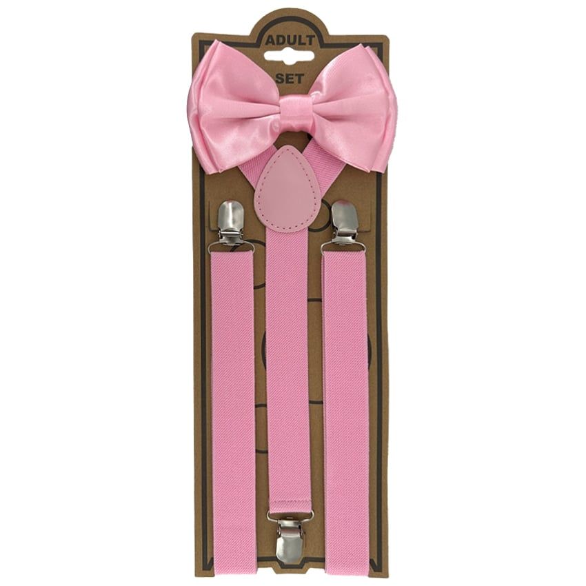 Adjustable Elastic Y Back Style Unisex Bowtie Suspender Set - Pink, 100% polyester woven material for extra comfort and long-lasting wear. What’ more, fitted with sturdy metal clips that firmly hold your pants Without falling apart for effortless, worry-free all-day wear. Dimensions: Length is from 24 to 42 inches. Width 1 inch. Elastic length can be up to 90 inches stretched.