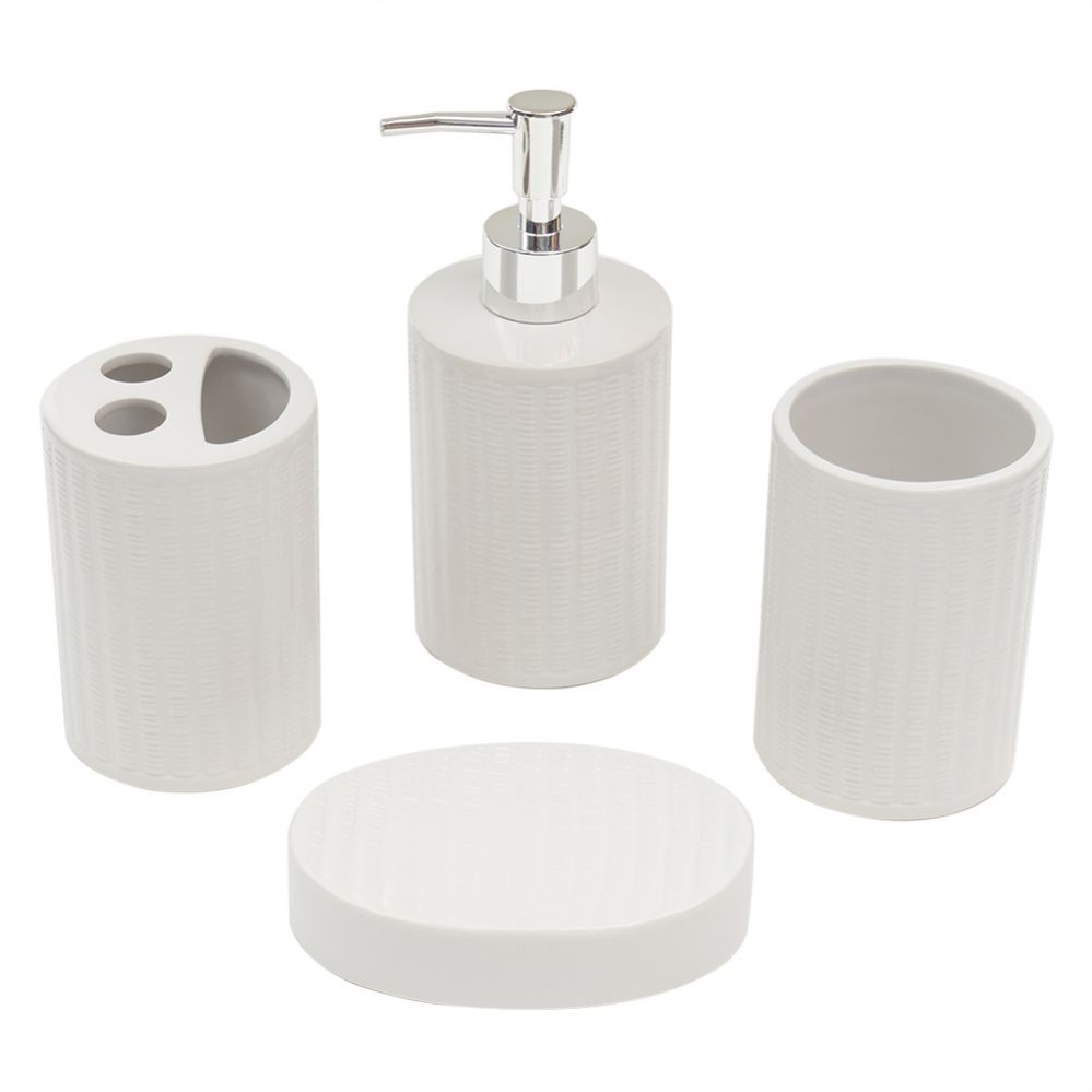 Set of 4 includes: 1 lotion dispenser, 1 tumbler, 1 toothbrush holder, 1 soap dish