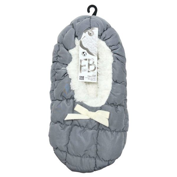 Stay warm and cozy with the Fuzzy Babba 1 Pack Quilted Puffer Slipper One Size in Grey, featuring a soft quilted exterior that gives a trendy puffer jacket look. The interior is lined with ultra-plush sherpa fabric for maximum warmth and comfort, while the stretchy opening ensures a snug, easy fit. A cute cream-colored bow adds a feminine touch to the sleek design. The non-slip grip dots on the bottom provide extra traction on smooth floors, making these slippers perfect for lounging at home. Comes packaged with a Fuzzy Babba hang tag and hanger.,Fuzzy Babba 1 Pack Quilted Puffer Slipper One Size in Grey,