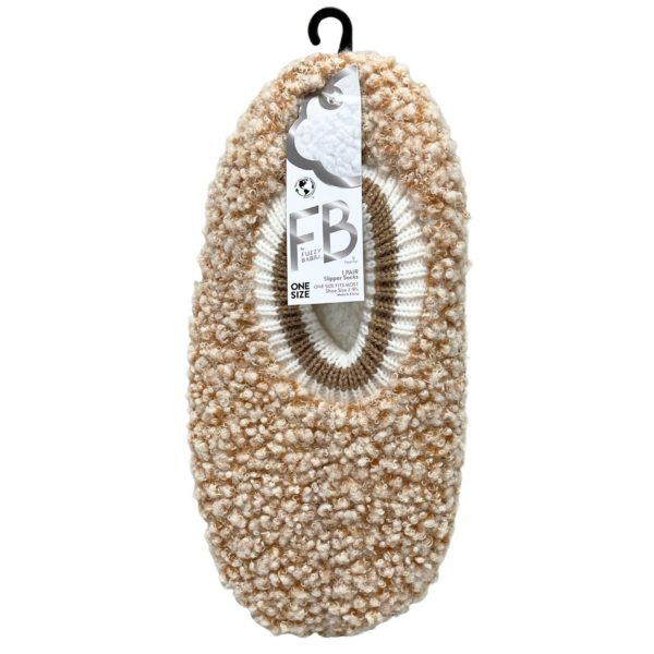 Step into softness with the Fuzzy Babba Women’s Beige Poodle Fur Slippers. These cozy slippers feature a plush, textured exterior and a warm, fuzzy lining that wraps your feet in comfort. The knit cuff provides a secure and flexible fit, adding a stylish contrast while keeping warmth in. With a gripper sole for extra stability on smooth floors, these slippers are perfect for lounging and relaxing at home. One size fits most women’s shoe sizes 4–10, and each pair is packaged with a hang tag for simple and attractive retail display.,Fuzzy Babba 1 Pack Womens Beige Poodle Fur Slipper With Knit Cuff in One Size Beige,