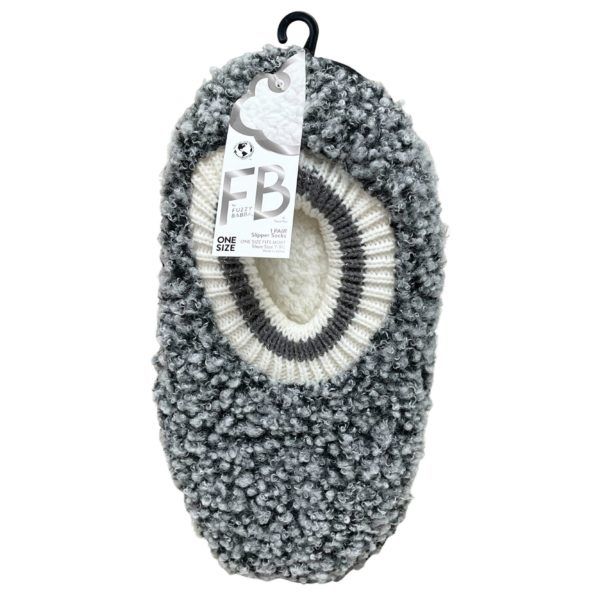 Stay warm and cozy with the Fuzzy Babba 1 Pack Women’s Grey Poodle Fur Slipper With Knit Cuff in One Size, featuring a soft, curly faux poodle fur texture in a stylish grey color. The ribbed knit cuff with cream and charcoal stripes offers a snug, comfortable fit that keeps warmth in while adding a cute, classic touch. Inside, the plush sherpa lining provides cloud-like comfort, and the non-slip grip dots on the sole ensure safe wear around the house. Perfect for lounging, relaxing, or gifting, these slippers combine softness, style, and everyday ease. Comes packaged with a Fuzzy Babba tag and hanger.,Fuzzy Babba 1 Pack Womens Grey Poodle Fur Slipper With Knit Cuff in One Size Dark Grey,