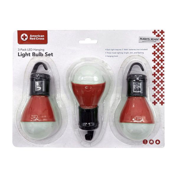 This 3-pack of battery-powered LED hanging lights is designed for portability and convenience, each featuring a built-in hook for easy suspension inside tents, sheds, or emergency shelters. Each light includes three settings: bright, dim, and flashing—ideal for campsite lighting, power outages, or signaling. Lightweight and easy to store, each bulb runs on 3 AAA batteries (not included). Packaged in an officially licensed clamshell card for retail display.