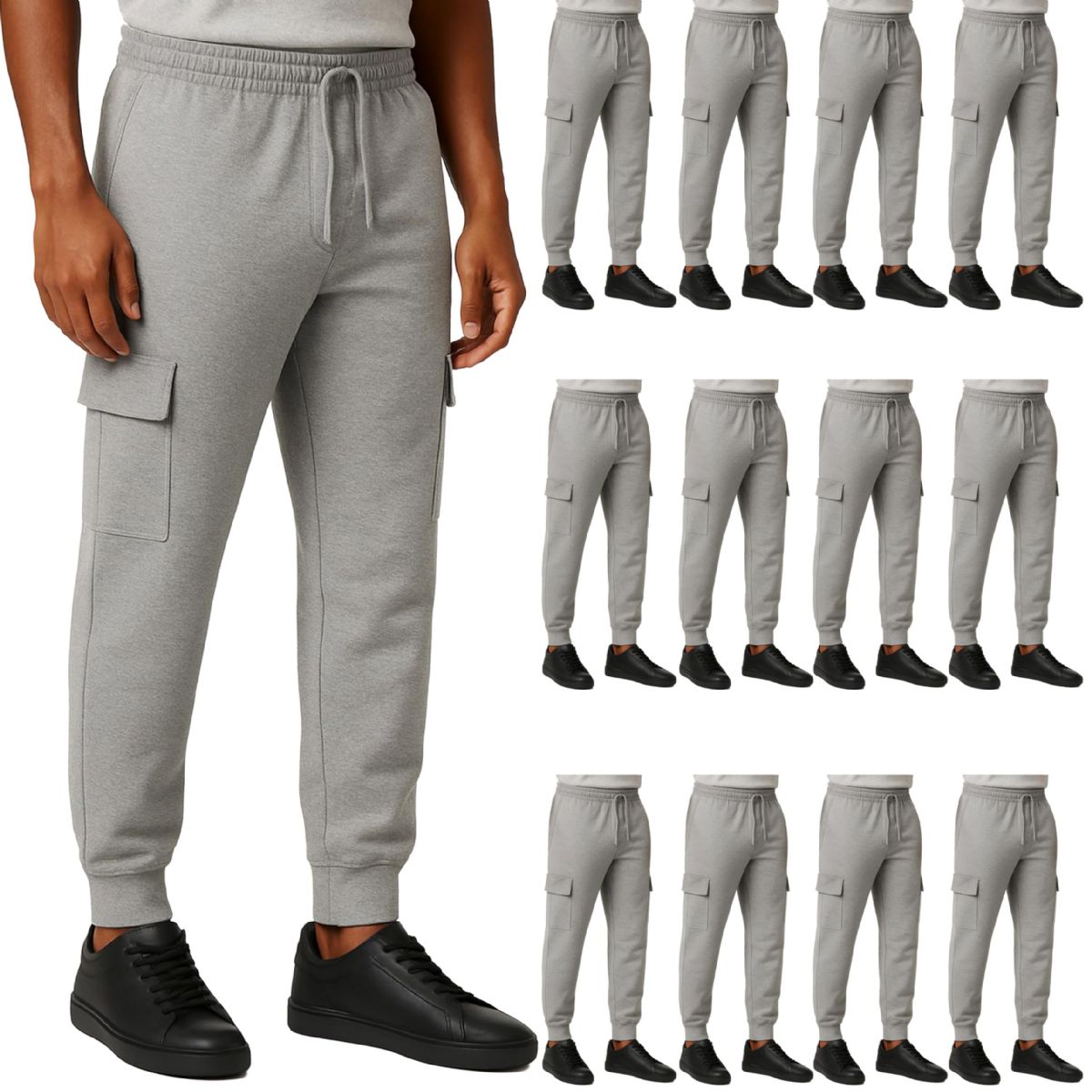 12 Bulk Mens Cotton Fleece Cargo Joggers In Heather Gray Assorted Sizes S-2xl