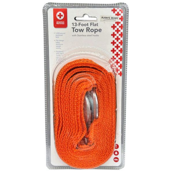 This 13-foot flat tow rope is constructed from durable nylon webbing and features heavy-duty stainless steel hooks for secure attachment. With a 3,300-pound working load limit, it’s designed to help move disabled vehicles, trailers, or equipment in a variety of roadside or light-duty situations. The flat design helps distribute weight evenly across the strap, reducing strain and enhancing grip. Packaged in a clear clamshell with officially licensed branding, this tow rope is a practical addition to vehicle emergency kits and automotive departments.,Nylon Tow Rope with Metal Hooks,