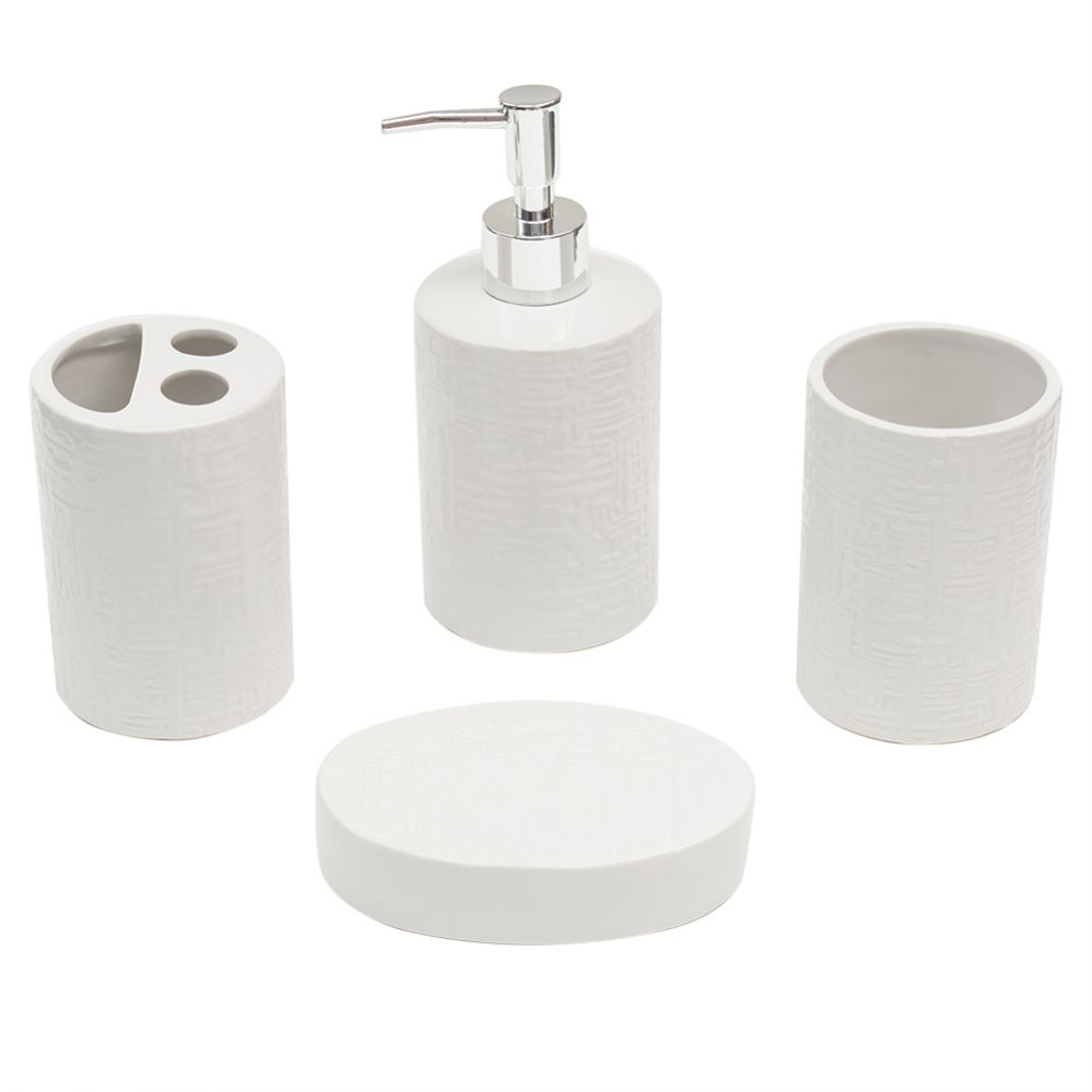 Set of 4 includes: 1 lotion dispenser, 1 tumbler, 1 toothbrush holder, 1 soap dish
