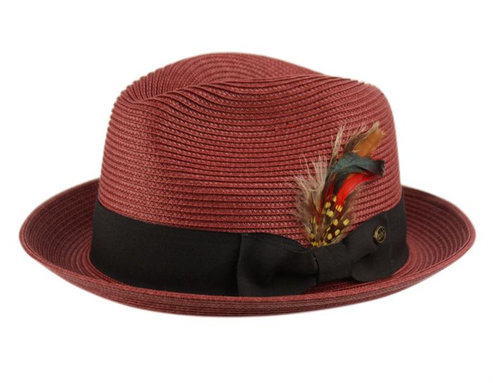 12 Bulk Poly Braid Straw Fedora Hats With Grosgrain Band And Removable Feather Assorted Burgundy