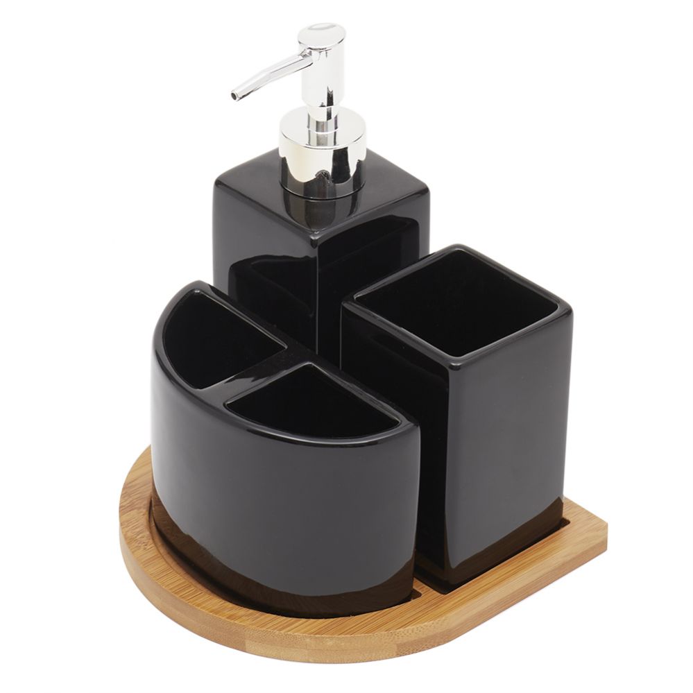 Modern design meets natural in this beautifully designed set of bath accessories. The set comes complete with a lotion dispenser, tumbler, toothbrush holder, and tray. The toothbrush holder is perfect for tidying up manual toothbrushes. The tumbler is perfect for drinking, rinsing, and providing organized storage for brushes, and travel toothpaste. The tray features compartments to fit each piece together. You can use the tray separately as vanity tray to store jewelry too. Gift to friends and family for the perfect housewarming gift. Hand wash each piece with warm water and use gentle soap. Dry thoroughly with a soft towel.