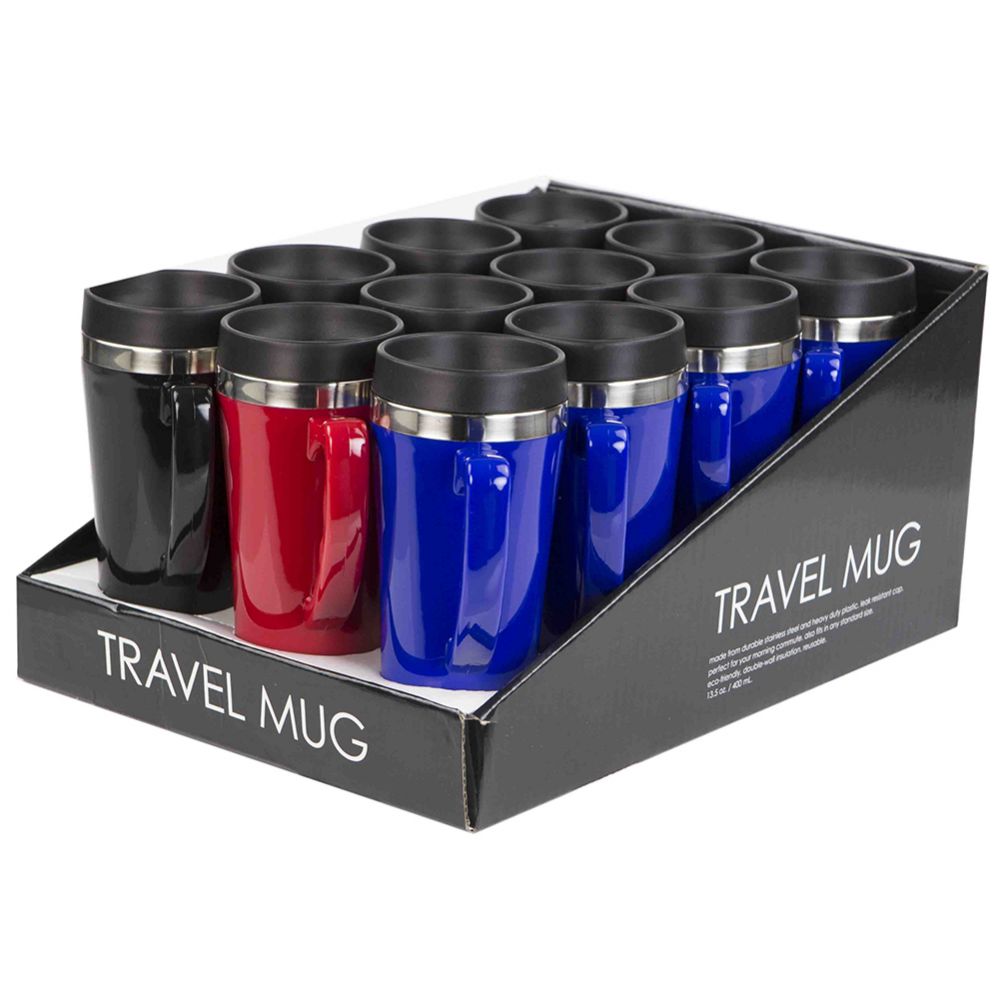 Take your coffee or tea on-the-go with this travel mug. Made from heavy duty stainless steel with a sturdy plastic lid that is spill-resistant. Double-wall insulation so your hands don't get too hot while holding.