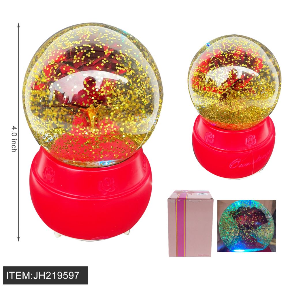 This romantic 4-inch crystal ball features integrated lights and music. It serves as a sentimental keepsake or decorative piece for Valentine's Day and anniversaries.