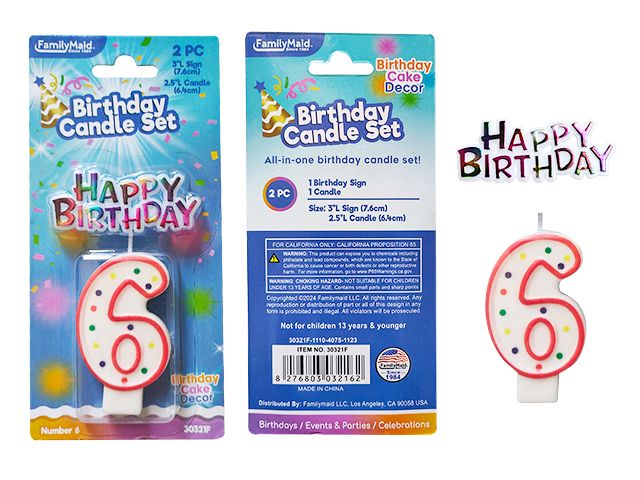 Celebrate a milestone age with charm and clarity using the 2-Piece Birthday Candle Set. Created for those who want a steady and reliable way to top off a cake with a festive message, this set pairs a bold "6" numeral with a classic "Happy Birthday" plaque. It is a smart choice for an easy-to-manage decorating routine, providing a professional and coordinated look that is perfect for a 6th birthday, a 60th anniversary, or a 16th/26th milestone when paired with other numbers. Built for a clean burn and high visibility, these candles provide a lasting solution for making your birthday wish organized and visually bright.