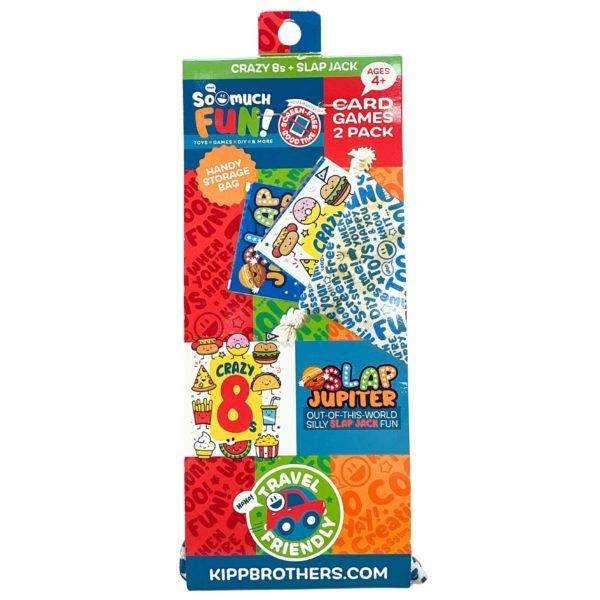 Enjoy hours of family fun with this 2 Pack Card Game Set in a handy fabric carry bag! This colorful set includes two classic games—Crazy 8s and Slap Jupiter (a space-themed version of Slap Jack)—perfect for 2 to 5 players ages 4 and up. The games come in a reusable blue drawstring bag with playful printed text, making it easy to store and travel with. Ideal for game nights, parties, or on-the-go entertainment, this set combines silly, out-of-this-world fun with timeless card play.,2 Pack Card Game in Fabric Carry Bag,