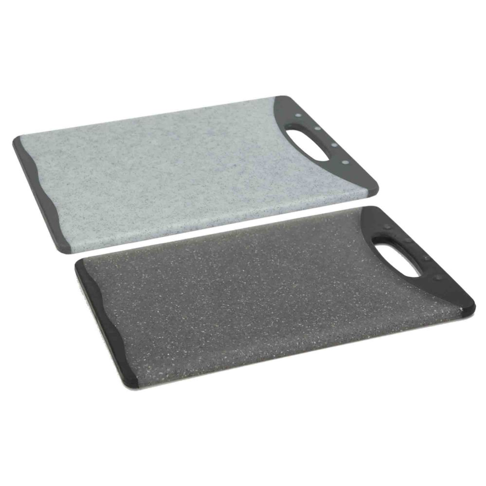 The richly, grained look of real granite without the weight, this plastic cutting board features a double-sided work surface that helps prevent cross contamination and mixing of flavors. Lay it on the counter and use it to chop ingredients on both sides. Or go from prep to serve by displaying a beautiful array of appetizers and desserts. When finished simply hand wash or toss in the dishwasher. When dry, easily store it on a kitchen rack by its open handle.