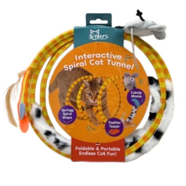 This Foldable and Portable Interactive Spiral Cat Tunnel is the perfect playtime accessory for curious and energetic cats. Measuring 9.5" in diameter when unfolded and stretching up to 20" long, its coiled spiral shape creates a twisting, tunnel-like structure that encourages natural feline behaviors like chasing, pouncing, and hiding. With dynamic elasticity for bounce and stretch, this tunnel keeps cats actively engaged. Each end features a fun hanging toy, a feathery teaser, and a catnip-filled mouse for added stimulation and excitement. Lightweight and easy to store, this tunnel is a must-have for cat owners looking to provide enrichment, exercise, and entertainment all in one clever design.,Foldable and Portable Interactive Spiral Play Cat Tunnel,