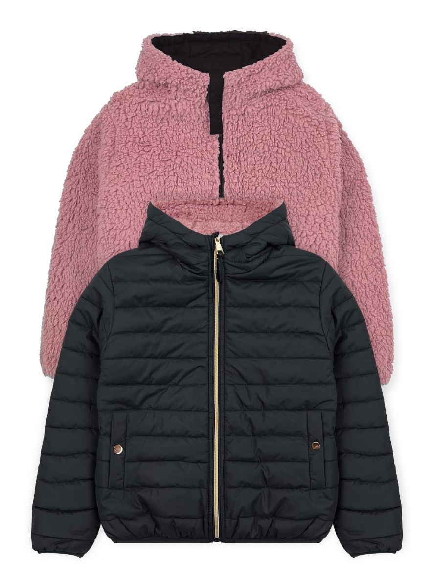 24 Bulk Girls Reversible Jacket With Sherpa Lining In Black And Pink Assorted Sizes 7-14