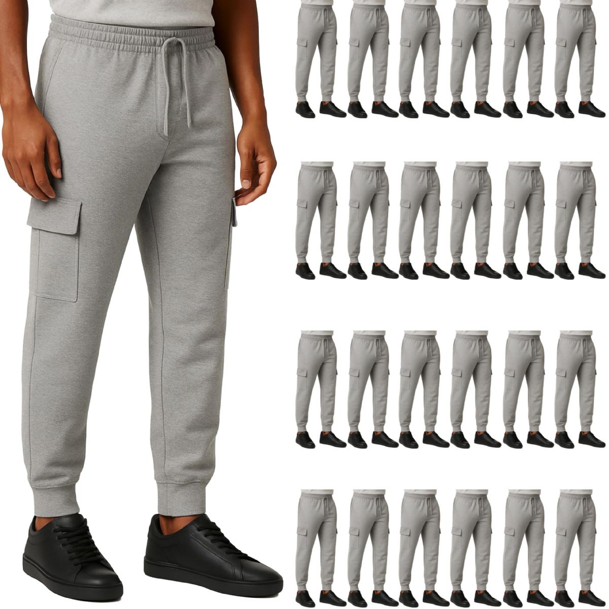 24 Bulk Mens Cotton Fleece Cargo Joggers In Heather Gray Assorted Sizes S-2xl