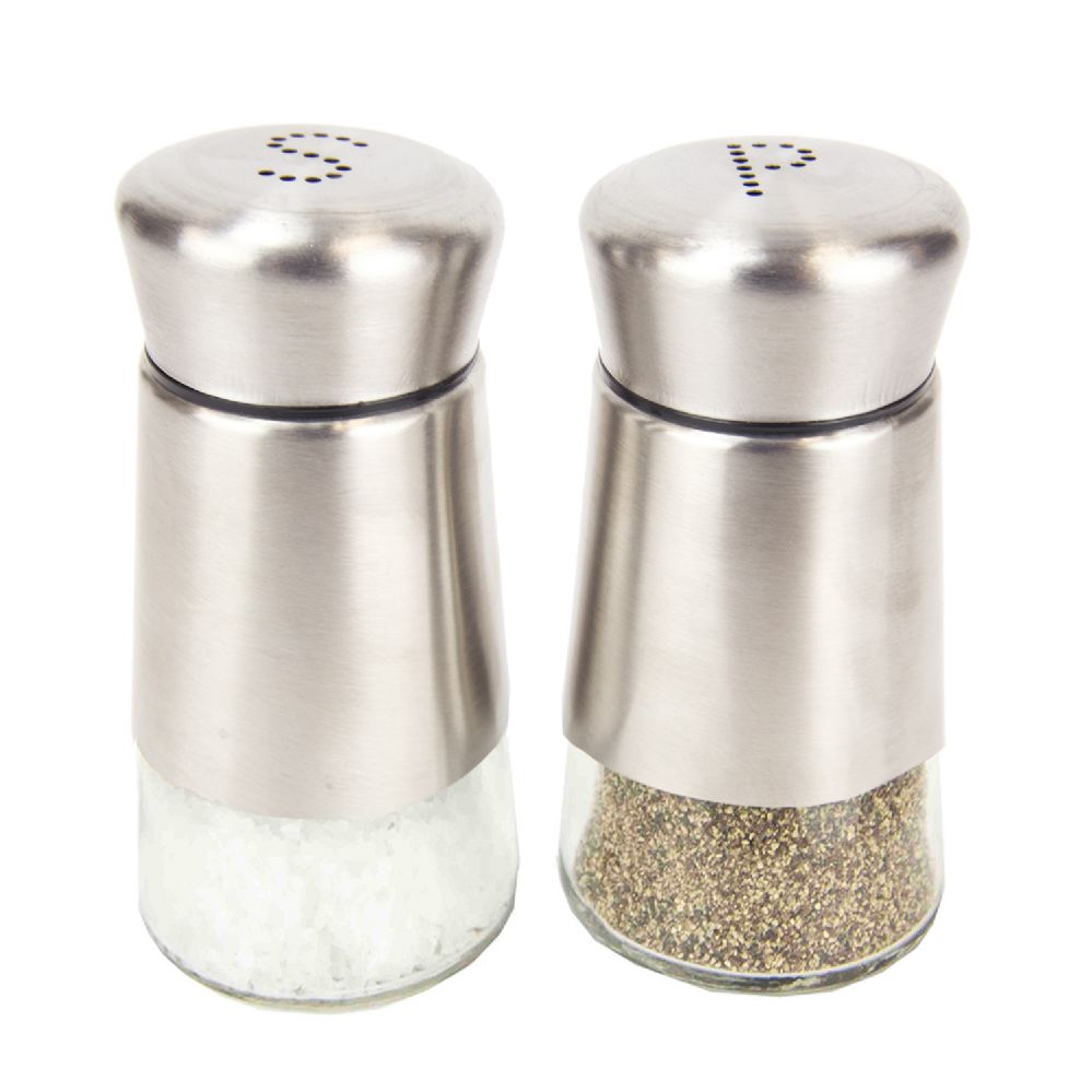 Salt and pepper Shaker set, essential for any tabletop setting. Shakers consist of an elegant glass bases with stainless steel tops easily dispense dry seasonings in a clean subtle manner. Hand wash. Closed seal top locks in flavor for maximum freshness.