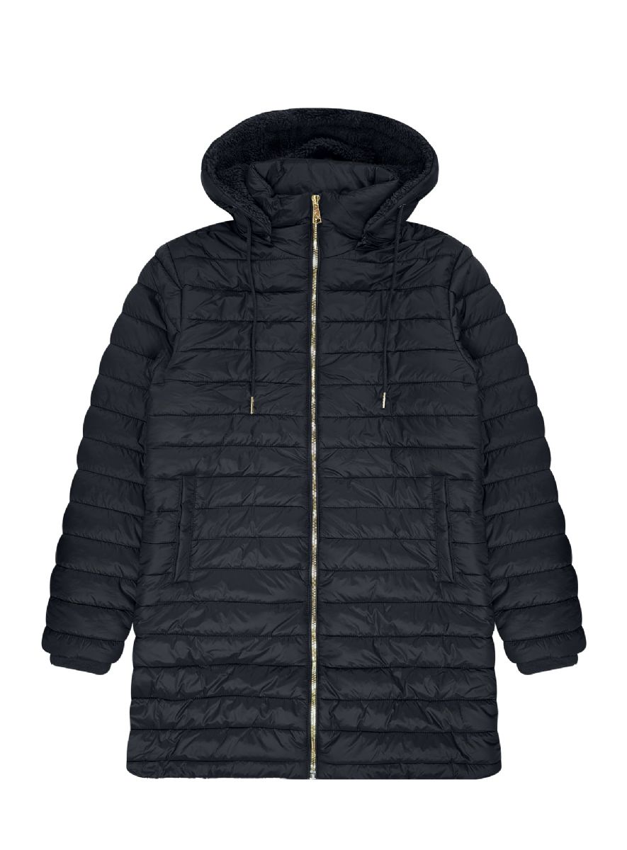 24 Bulk Womens Longline Hooded Puffer Jacket With Sherpa Lining In Black Assorted S-2xl