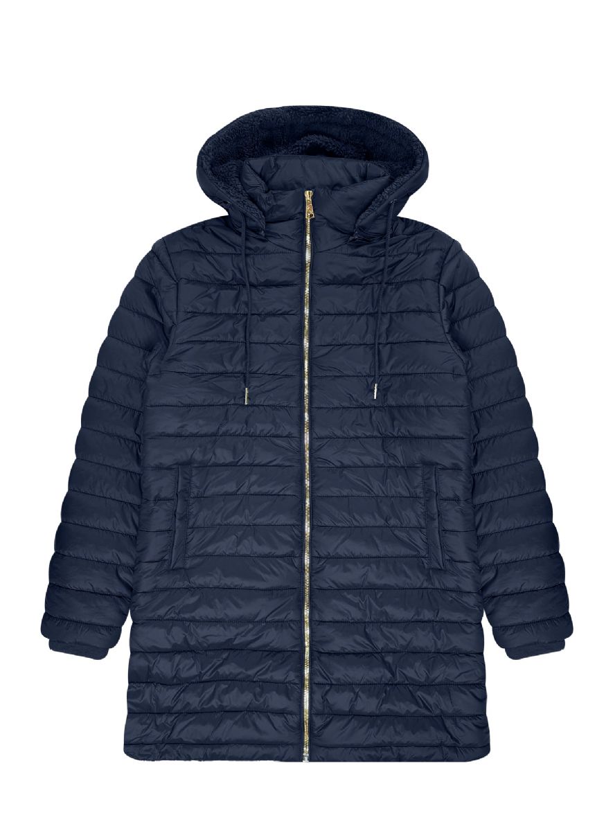 24 Bulk Womens Longline Hooded Puffer Jacket With Sherpa Lining In Navy Assorted S-2xl