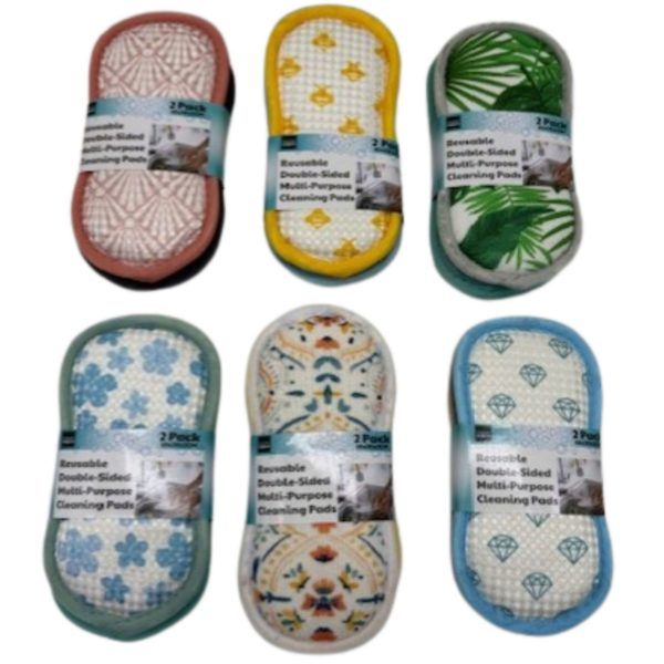 Make cleaning easier and brighter with this All Purpose 2 Pack Set, Each sponge measures 3" x 7.3", featuring durable scrub sponges in six assorted color combinations. Each pad features two textured surfaces that help tackle a variety of messes, from wiping countertops and appliances to scrubbing sinks and other hard surfaces. The compact, ergonomic shape allows for easy handling, while the stitched edges provide added durability for long-lasting performance. Bright, modern patterns add visual appeal, making them a practical and attractive cleaning solution. The set comes packaged in a colorful hanging wrap. ,2 Pack Reusable Double-Sided Multi-Purpose Cleaning Pads in Assorted Colors and Designs,