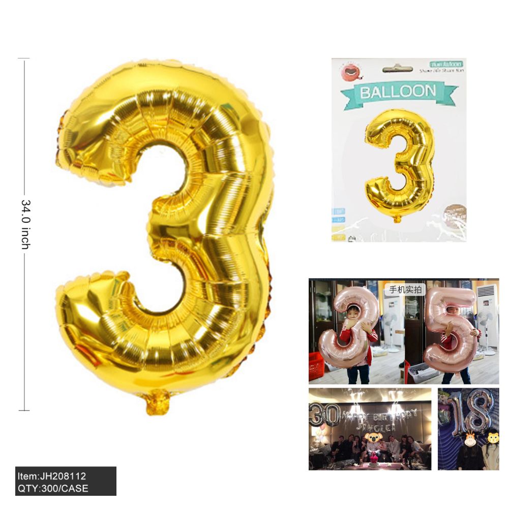 This 34" gold aluminum balloon in the shape of the number ?3? is perfect for birthdays, anniversaries, or any celebratory event.