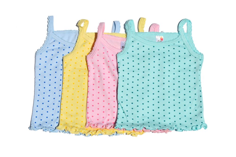 Adorn your little ones in style with our Girl's Colored Polka Dot Spaghetti Tank Tops. This 300 pack features tank tops in assorted colors that are perfect for girls aged 4-6 years.