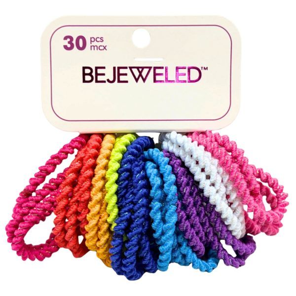 Add a pop of color and sparkle to your hair with the Bejeweled 30 Pack Hair Ties in Multiple Colors! These fun, twist-style elastics are clasp-free and gentle on hair, offering a secure hold without snagging or pulling. Featuring a mix of bright, metallic colors, they’re perfect for coordinating with any outfit or occasion. Ideal for ponytails, braids, or casual updos, these flexible and durable hair ties work great for all hair types. The large 30-count pack ensures you’ll always have one on hand at home, school, or on the go.,Bejeweled 30 Pack Hair Ties in Multiple Colors,