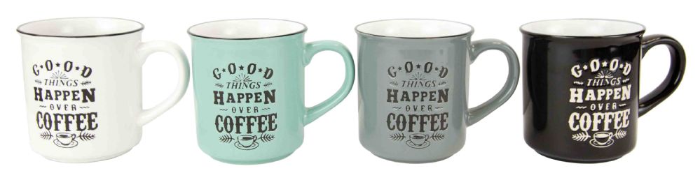 Set this charming cup on your countertop or your carefully planned out tablescape and you'll sure inspire sparkling conversation at your next soiree with its inspirational quote and vibrant finish. This 12 oz. is made out of durable bone china that makes it less prone to chipping. It features the words "Good Things Happen Over Coffee" along the front of the mug. From creamy hot cocoa to freshly squeezed orange juice, fill it to the brim with your favorite piping hot brew or ice-cold beverage to enjoy all-year round.