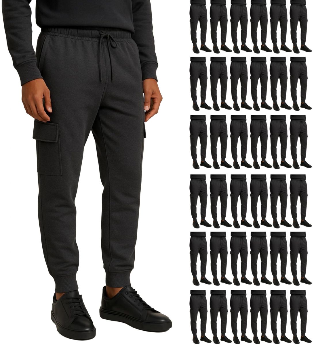 36 Bulk Mens Cotton Fleece Cargo Joggers In Charcoal Gray Assorted Sizes S-2xl