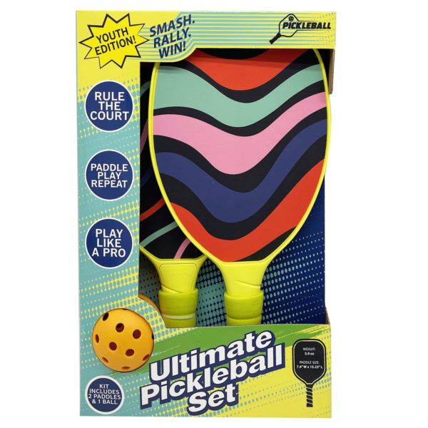 This Youth Pickleball Starter Set is perfect for beginners and younger players just getting into the game. The set includes two paddles in assorted designs, paddle prints, and one 26-hole pickleball, offering everything needed for casual or starter play. Each paddle measures 7.4" x 15.2" and is made from lightweight yet durable materials, including plastic, PP, TPE, and NBR, making it easy to handle for smaller hands. The 4.5" soft cushioned grip with a 1.25" circumference ensures comfortable and secure handling during play. Whether for learning the basics or enjoying casual backyard games, this set provides a fun and accessible introduction to pickleball for youth players. The set comes packaged in a color window box. The package measures 10" x 2" x 15.4".,7.4" x 15.2" Youth Pickleball Paddles and Ball Starter Set in Assorted Designs,