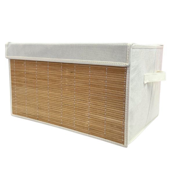 This collapsible bamboo fabric storage bin measures 17.25" x 12" x 10" and features two sturdy side handles for easy lifting and transport. Designed with a natural bamboo panel front and durable fabric sides, it provides a stylish and practical storage solution for any room. Ideal for organizing clothing, towels, toys, linens, books, or household items, this bin helps reduce clutter while complementing home decor. Its foldable, space-saving design allows it to be conveniently stored when not in use, making it perfect for closets, shelves, laundry rooms, and more.,Foldable Bamboo Storage Box with Handles and Lid,