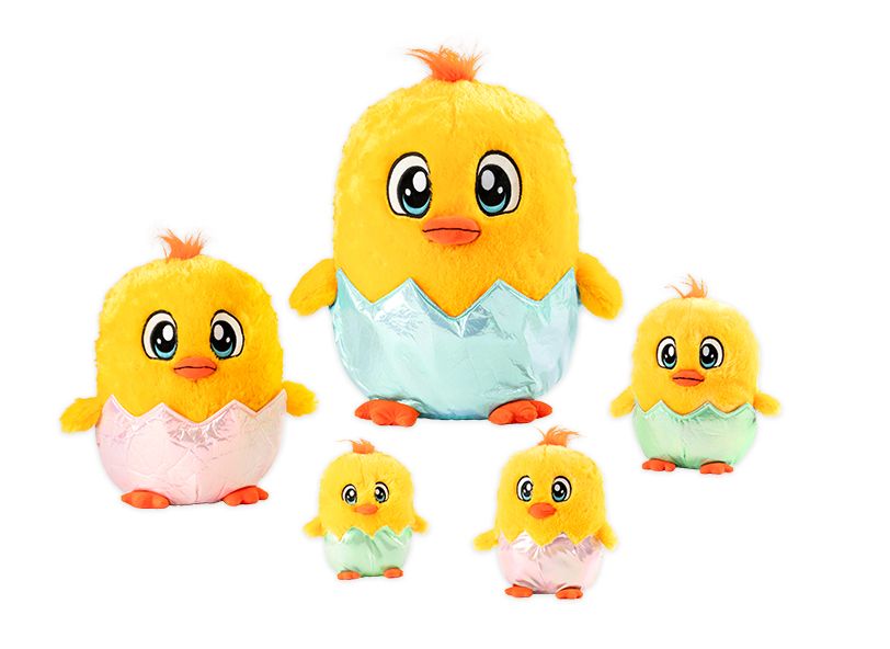 Celebrate springtime and new life with the 11-17 inch Eggy - Eggshell Chick Plush Toy. This large stuffed animal features an adorable Chick emerging from a cracked Eggshell, named Eggy. Perfect for Easter gifts, novelty retail, or themed collections.