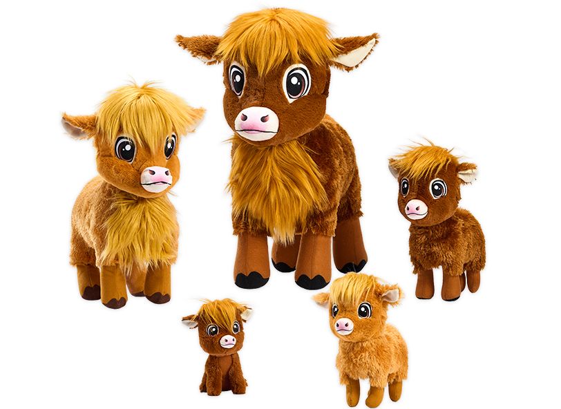 Introduce the sizable and shaggy 11-17 inch Harlee - Highland Cow Plush Toy. This large stuffed animal features the distinctive long horns and fuzzy coat of a Highland Cow named Harlee. Perfect for children's retail, gifts, or farm-themed collections.