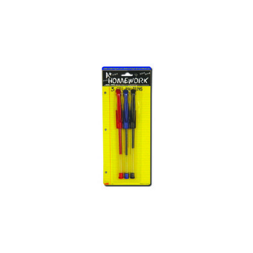 3 pack of gel ink pens for school and office. three colors per pack including red, blue and black. Card pack with hang tag.