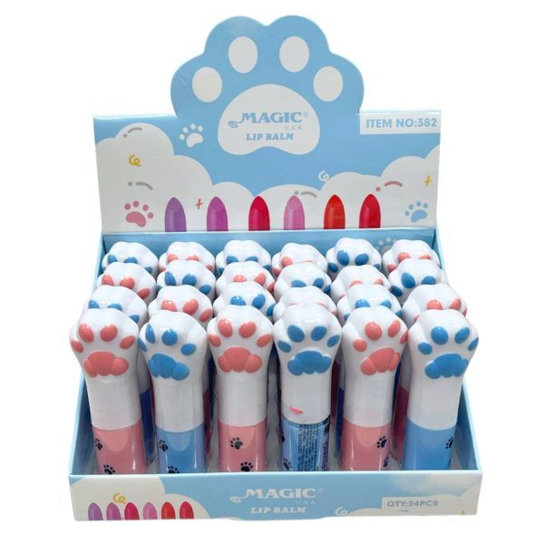 The Magic USA All in One Lip Balm offers a fun and colorful lip care option packaged in adorable paw-print themed tubes that appeal to kids and beauty lovers alike, with each balm featuring a playful white cap shaped like a cat paw and a coordinating pastel body in pink or blue. The tinted balm twists up to reveal a vibrant lip color, providing smooth application and lightweight moisture. Each unit comes displayed in a bright blue countertop box with paw graphics and product shades shown across the header, holding twenty-four pieces neatly arranged for easy retail presentation.,Magic USA All in One Lip Balm in Countertop Display,