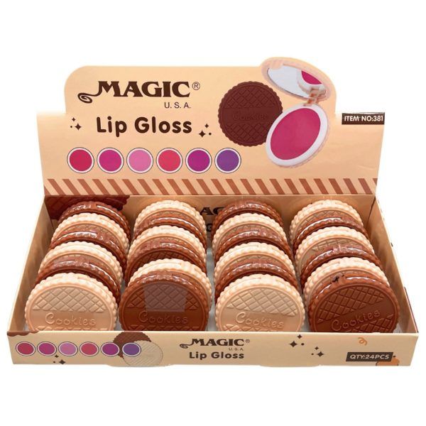 Magic USA Cookie Jar Lip Gloss Compacts come in an adorable countertop display filled with cookie-shaped gloss containers that flip open to reveal vibrant lip color and a built-in mirror. Each compact features a textured cookie design in assorted tan and brown styles, adding a fun, novelty look perfect for gifting or impulse buys. Inside, the brightly tinted gloss offers a smooth, shiny finish, while the compact size makes it easy to toss into a purse, backpack, or pocket. Packaged in a retail display holding 24 cookie compacts, this collection delivers cute, playful beauty essentials with eye-catching presentation.,Magic USA Cookie Jar Lip Gloss Comapct with Mirror in Countertop Display,