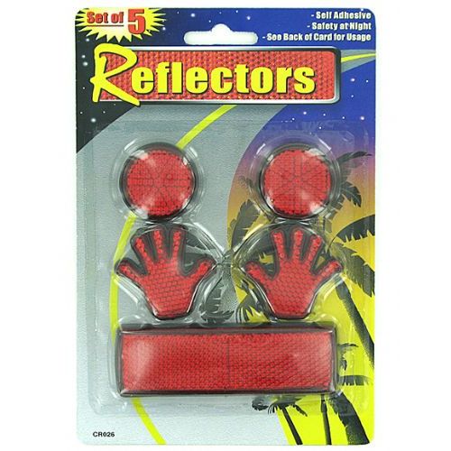 Perfect for safety at night on bicycles and more, this 5-piece Self-Adhesive Reflectors Set comes in assorted fun shapes including: two round shapes, two hand shapes and one long rectangle. Faceted surface is covered with clear red plastic for light reflection and has self-adhesive backing for attachment. Approximate measurements: round - 1 1/4 in diameter, hand - 1 3/4 in wide and rectangle - 1 in x 3 1/2 in. Comes packaged in a blister pack.