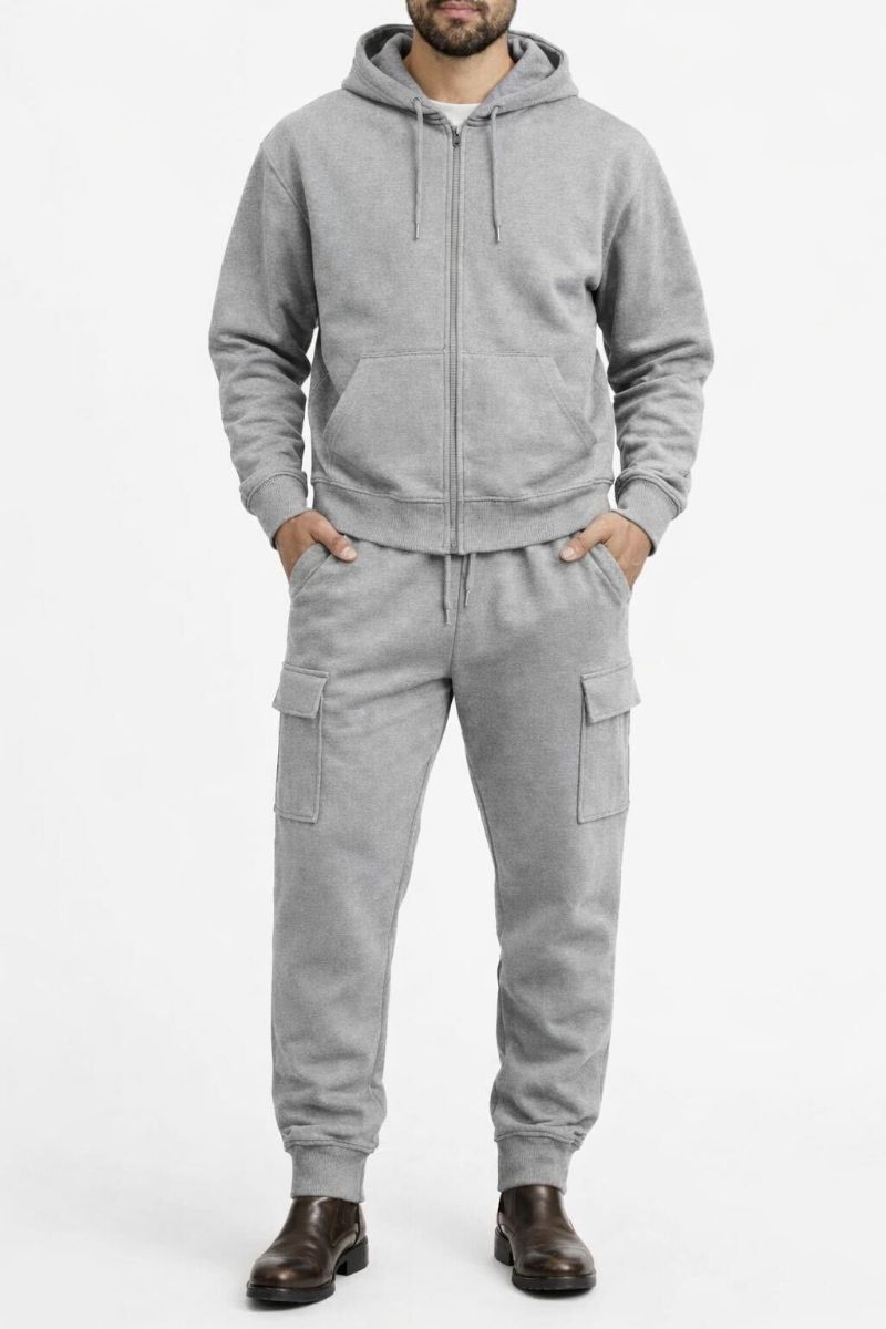 72 Bulk Cotton Fleece Cargo Jogger And Zipper Hoodie Set In Heather Gray Assorted Sizes M- 2xl