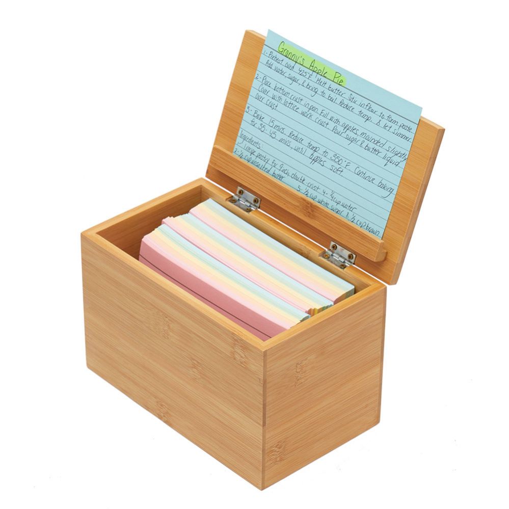 Preserve your precious recipe cards from unwanted stains using this recipe box. The small ledge on the inside of the lid lends an extra hand by keeping your recipe card front and center for ease of viewing while cooking. As soon as you finish following along you can toss the card inside with the rest of your vast collection. The lid sits securely over the box, keeping a stack of your recipes in pristine condition. This cute and compact box not only keeps your cooking instructions neatly contained, but is great for storing a grocery list, a little reminder, or a thoughtful note. Hand wash recommended. Assembly is not required. Recipe cards are not included.
