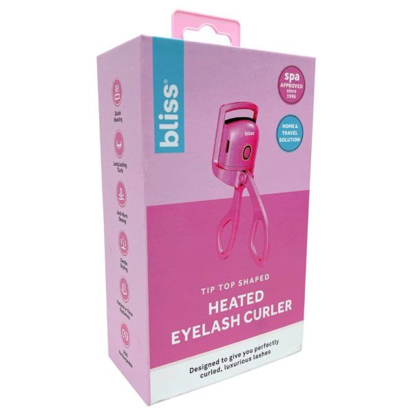 The BLISS rechargeable heated eyelash curler in pink is designed to help create beautifully curled lashes with a sleek, compact tool that fits comfortably in your hand. The curler features a tip-top shaped heated head with a single-button operation, shown with an indicator light on the front, and is designed for gentle styling on natural or false eyelashes. As displayed on the packaging, it offers quick heating, long-lasting curls, an anti-burn design, and gentle styling, making it suitable for everyday use at home or while traveling. The curler is rechargeable via USB and comes packaged in a branded BLISS retail box with a hanging tab, featuring spa-approved and home-and-travel solution icons, along with a molded interior tray that securely holds the curler and charging cable inside.,BLISS Rechargeable Heated Eyelash Curler in Pink,
