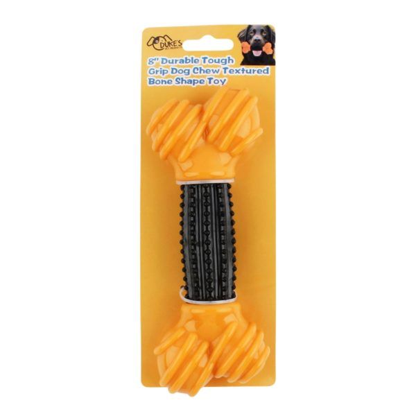 This Durable Tough Grip Dog Chew Bone Toy is designed for powerful chewers who love a good challenge. Measuring approximately 2.75" wide by 8" long, this bone-shaped toy combines a rugged, textured surface with a strong rubber-like construction to help satisfy natural chewing instincts while promoting dental health. Its tough grip design helps clean teeth and massage gums, reducing tartar buildup during play. Ideal for solo chewing or interactive fetch games, this toy helps curb boredom and destructive behavior. A great choice for pet owners seeking a long-lasting, engaging toy that encourages healthy habits in their dogs. The set comes packaged on a hanging tie card.,Durable Tough Grip Dog Chew Textured Bone Shape Toy,