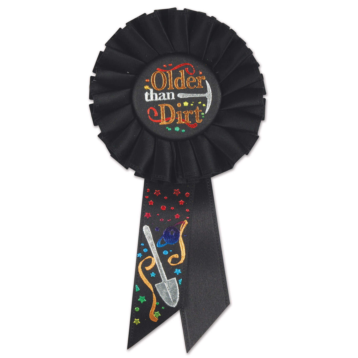 The "Older Than Dirt" rosette is a humorous over-the-hill award, perfect for milestone birthdays and gag gifts that celebrate aging with a smile.