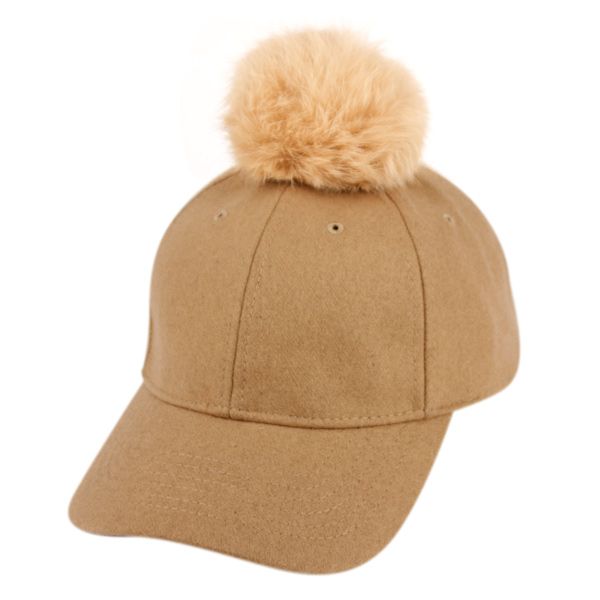 6 Bulk Six Panel Solid Color Wool Blend Cap W/rabbit Fur Pom Pom Khaki
