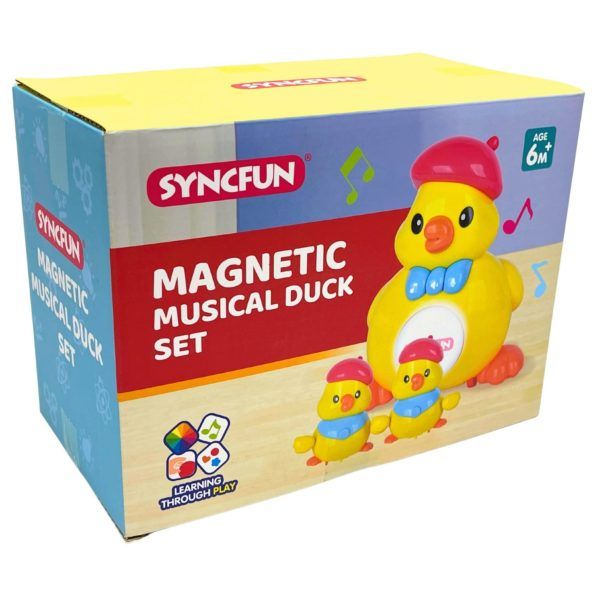Bring playtime to life with this colorful Syncfun Magnetic Musical Duck Set, featuring an adorable mama duck and two baby ducks that follow along using built-in magnets. Each duck lights up, plays music, and offers fun interactive buttons including music, recording, light, and volume controls, plus multiple modes shown on the product: sleep, power off, and dynamic. Kids can watch the ducks spin while holding hands or circle around objects for extra movement fun. Bright, engaging colors and smooth, rounded shapes make them ideal for little learners, while tummy-time and crawling play is encouraged as babies chase the waddling ducks. Set comes boxed exactly as shown, designed for ages 6 months and up.,Syncfun Magnetic Multi Function Musical Duck Set,