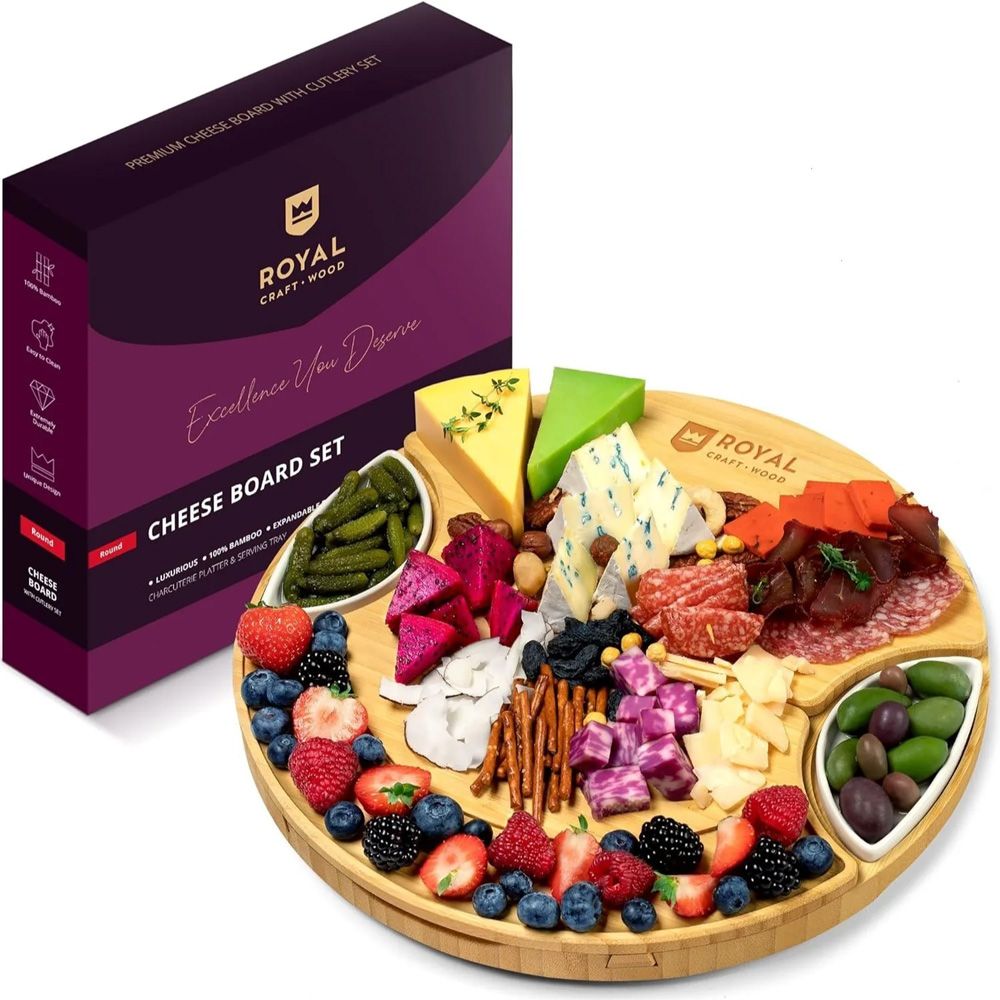 Elevate your hosting experience with this 13.7" Round Bamboo Cheese Board, meticulously crafted to perfection for a premium look and feel. Made from high quality bamboo, this board features a beautiful natural bamboo color that adds a stylish and elegant touch to any table setting. The durable construction ensures it stands up to frequent use, making it perfect for serving various types of food, from gourmet meats to artisan crackers. This comprehensive set includes two ceramic bowls and a 3-piece cutlery set, providing everything needed for creating professional-grade charcuterie boards. Whether for a dinner party or a casual get-together, this board is designed for both functionality and aesthetic appeal. Each unit comes individually boxed, making it a convenient and attractive option for retail or gifting.