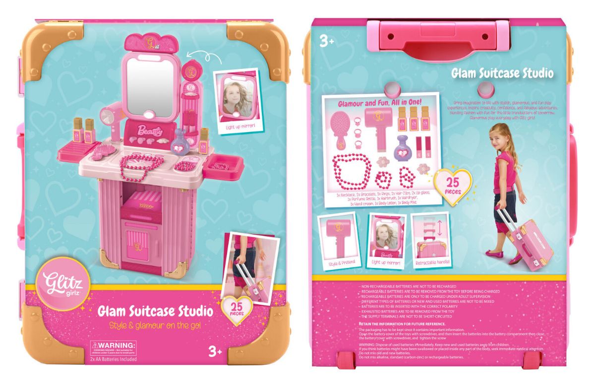This beauty luggage set is a pretend play toy that typically includes makeup or hairstyling accessories housed in a suitcase or carry case. It encourages role-playing and imagination.