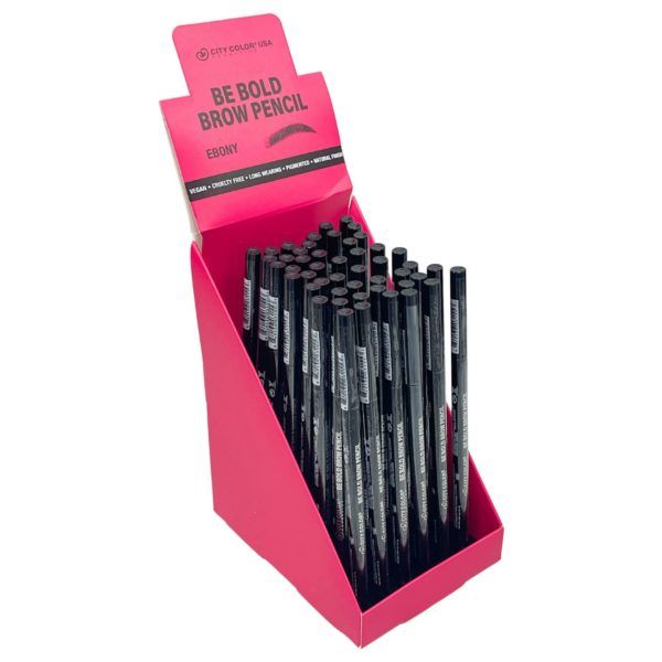 Shape, define, and perfect your brows with the City Color Be Bold Ebony Brow Pencil. This ultra-precise retractable pencil delivers smooth, controlled strokes for natural or bold definition. The rich ebony shade fills in sparse areas effortlessly, while the built-in spoolie blends for a flawless, sculpted finish. Ideal for creating long-lasting, smudge-resistant brows that stay put all day. Comes packaged in sleek black with a matching cap and displayed in a countertop display.,Be Bold Ebony Brow Pencil in Countertop Display,