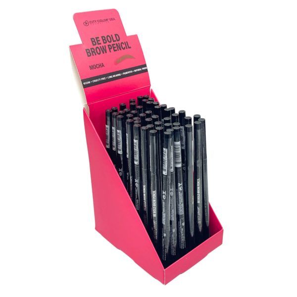 Shape, define, and perfect your brows with the City Color Be Bold Mocha Brow Pencil. This ultra-precise retractable pencil delivers smooth, controlled strokes for natural or bold definition. The soft mocha shade fills in sparse areas effortlessly, while the built-in spoolie blends for a flawless, sculpted finish. Ideal for creating long-lasting, smudge-resistant brows that stay put all day. Comes packaged in sleek black with a matching cap and displayed in a countertop display.,Be Bold Mocha Brow Pencil in Countertop Display,