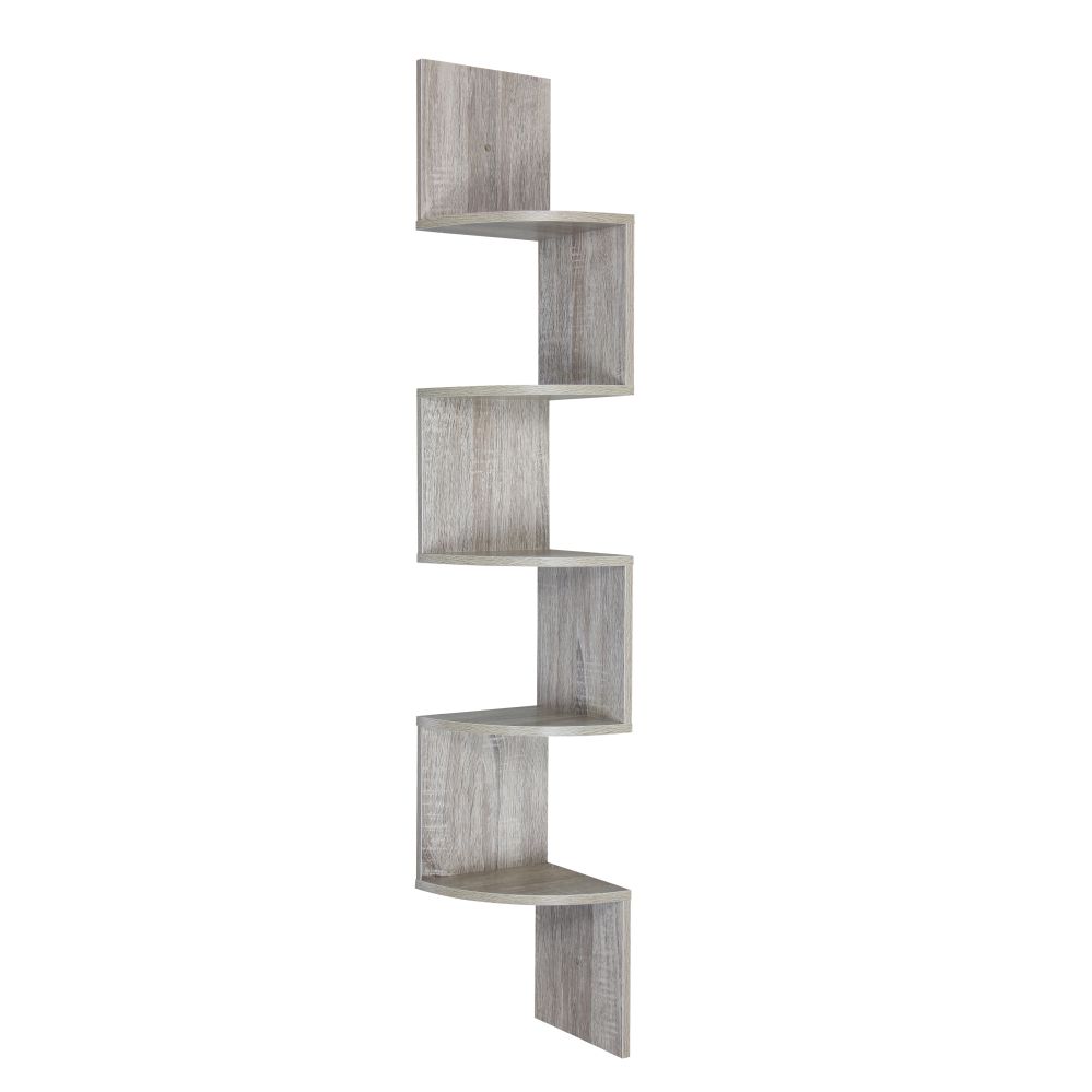 Display modernly and innovatively with this five-tier corner shelving. It has a zig zag design that is stylish and will provide a unique touch to any space. Place trinkets, small potted plants, mini sculptures, picture frames, and other décor to stand out boldly. It is great for placing other items such as books, small accessories, eyewear, and keys. It is made from durable MDF, and each shelf can support a weight capacity of 2.2 lbs. It is perfect for areas such as a hallway, family room, bedroom, office, or study. Minimal assembly is required, follow packaging setup and you are good to go.